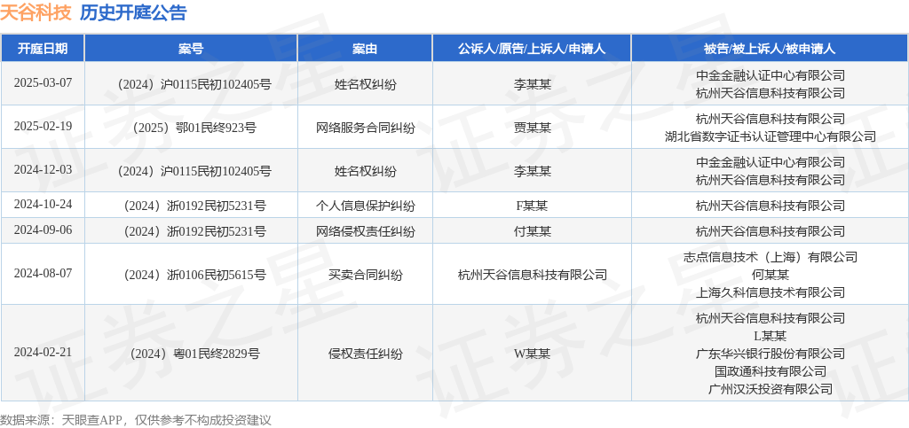 案号:(2025)鄂01民终923号审理法院:湖北省武汉市中级人民法院案由:网络服务合同纠纷当事人信息: 原告/上诉人:贾某某 被告/被上诉人:杭州天谷信息科技有限公司、湖北省数字证书认证管理中心有限公司开庭日期:2025年2月19日根据统计,近一年内以杭州天谷信息科技有限公司为当事人的历史开庭公告有7则,其中案由为“姓名权纠纷”的公告以2则居首,其次为“个人信息保护纠纷”有1则,“买卖合同纠纷”有1则。历史开庭公告如下: